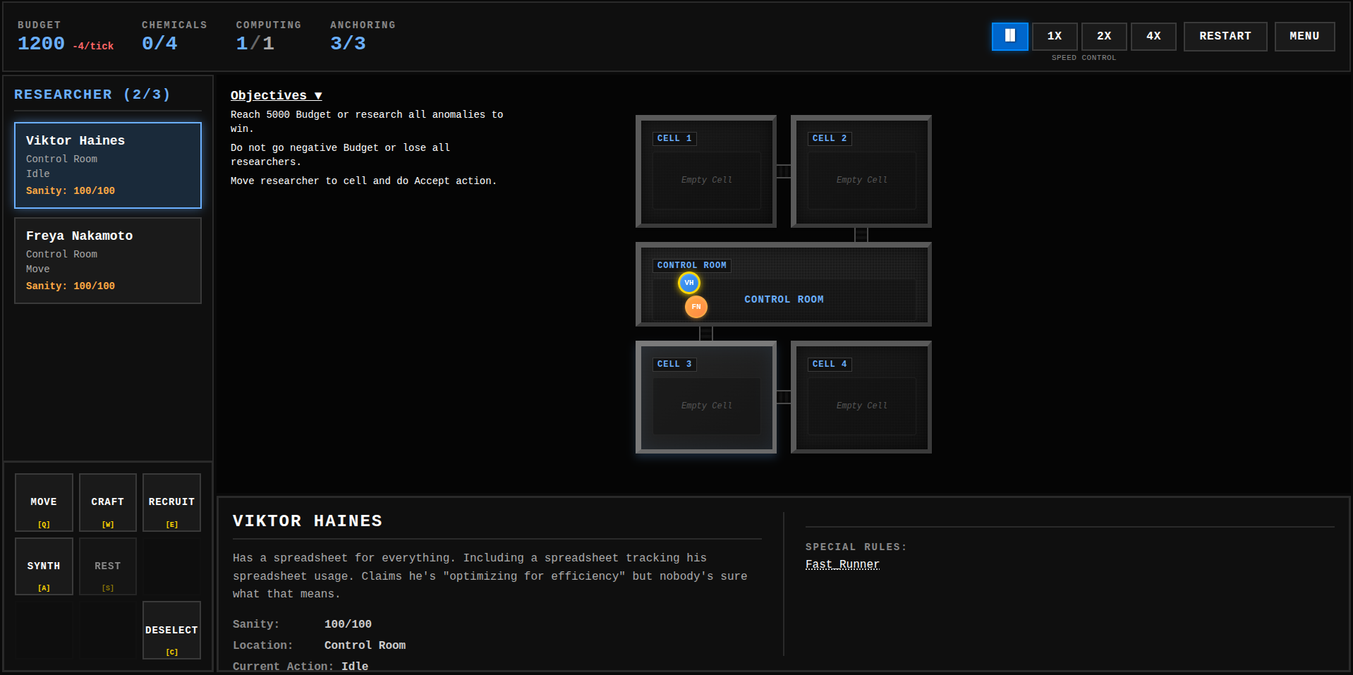 - Manage Resources: Balance Budget (drains over time from general use and from wages), Chemicals, Computing, Reality Anchoring (prevents dimensional breaches), and Researcher Sanity.