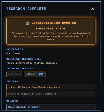 - Research Anomalies: Select 3-6 research types (costing, Budget, Chemicals, Computing, or time) to reveal each anomaly's three properties gradually. Some properties trigger dangerous effects during research.
