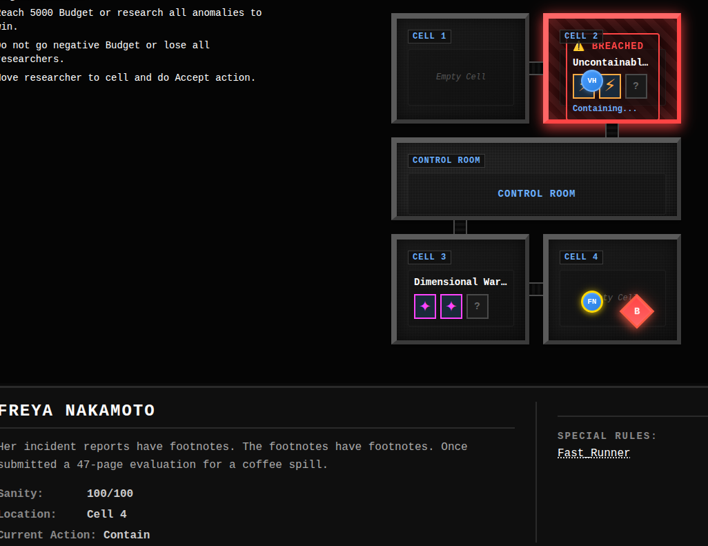 A horror-themed strategy game where you run a research facility studying dangerous anomalies. Manage researchers who risk death, memetic contamination, or worse, while uncovering the properties of reality-breaking entities. Balance scientific progress with survival as anomalies breach containment, researchers lose their minds, and reality itself begins to fracture.