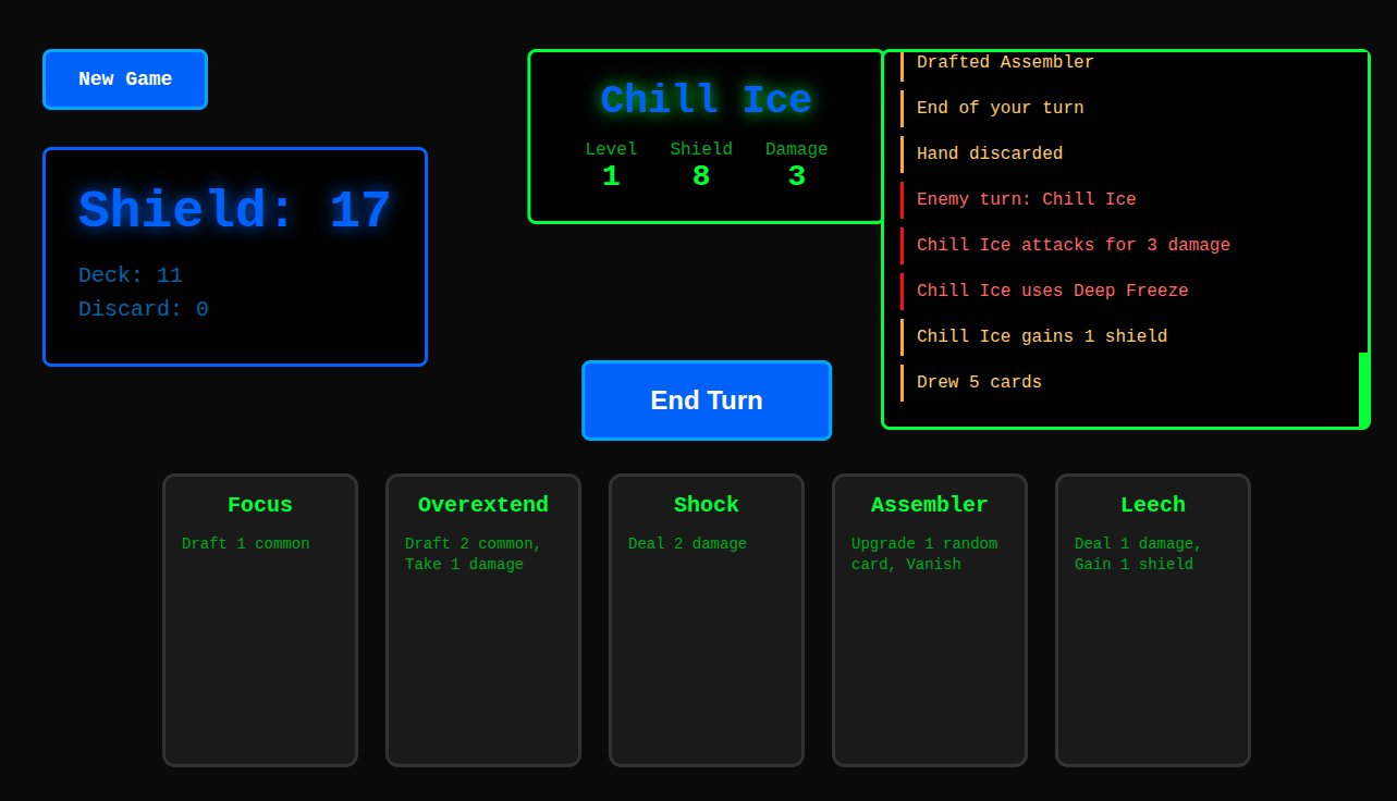 A cyberpunk-themed deckbuilder. You are a hacker trying to access servers you shouldn't, and the corporate-ICEs intercept you. Face against a few Corpo-Ices. You must reduce their shield to 0 before your shield becomes 0.