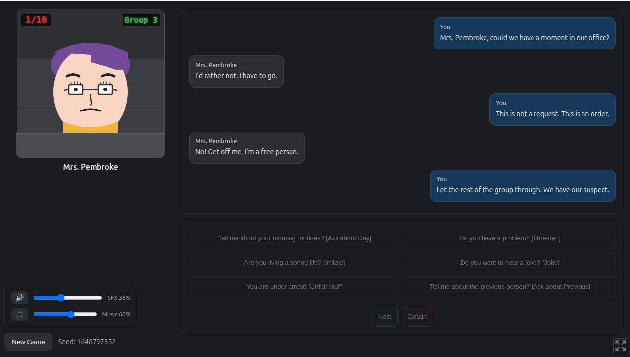 Instructions are available on the starting screen. Gameplay consists of reading dialogue, choosing dialogue options, and ultimately choosing whom to pass and whom to detain.